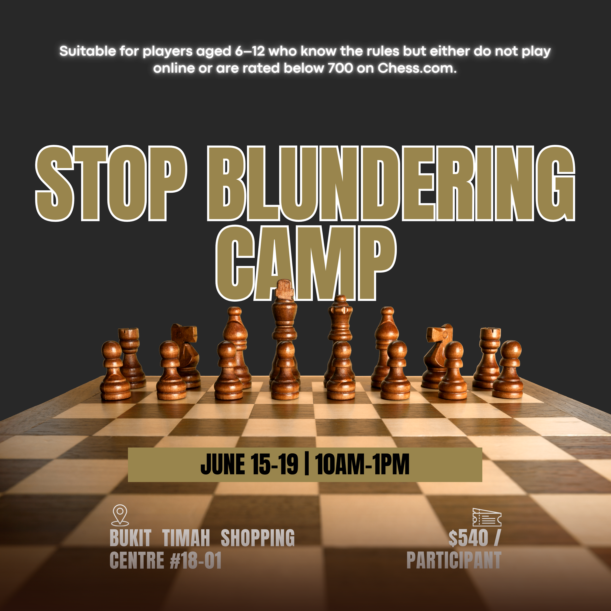 The Stop Blundering Camp is suitable for players aged 6–12 who know the rules but either do not play online or are rated below 700 on Chess.com.