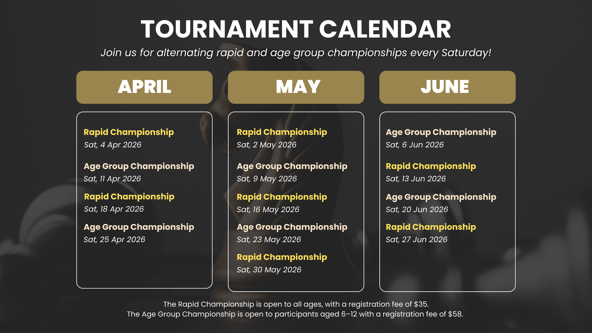Our Age Group Championship is only for players aged 12 and under as of 1 Jan 2026. It is beginner friendly and the minimum recommended level to play is the ability to play a full game of chess without illegal moves.